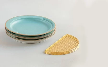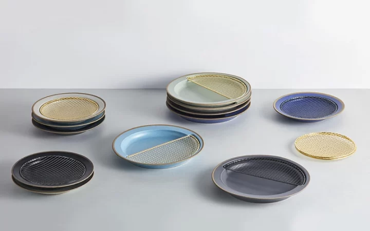 モダンなデザインの岐阜県の美濃焼のプレートにモダンで洗練された美しさの純金網とシックな黒酸化網。それぞれお皿の色に合わせて網も色を変えています。どの色も素敵で悩みますよね〜家族で同色に揃えたり、いくつか色を組み合わせたり、色違いにするのもお洒落!